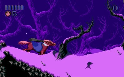 Графика. Мы уже не однократно отмечали, что сеговские игры по мотивам мультфильмов Диснея - это особый уровень визуальной реализации реализации. В качестве примера можно привести того же Короля Льва или Приключения Алладина. В самом начале в игре преобладают светлые пастельные тона, но по мере прохождения цвета становятся темнее в соответствии с развитием событий. Внешние черты героев идеально прорисованы и полностью соответствуют своим оригинальным мультипликационным прототипам.